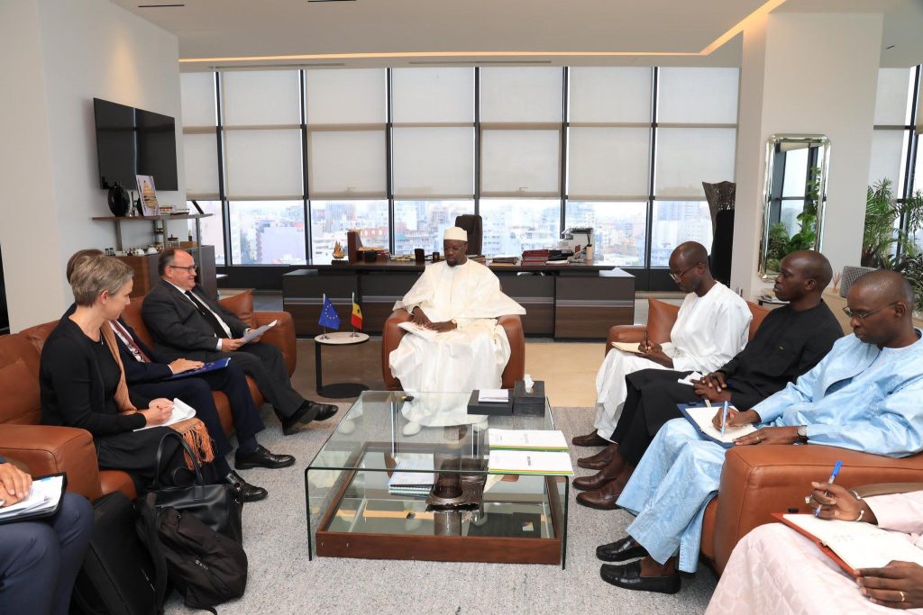 Le Premier ministre S.E. Ousmane SONKO a chaleureusement accueilli aujourd’hui 𝐌. 𝐅𝐚𝐲𝐨𝐥𝐥𝐞, Vice-Président de la Banque Européenne d’Investissement (@EIB ), accompagné de 𝐌. 𝐉𝐞𝐚𝐧-𝐌𝐚𝐫𝐜 𝐏𝐢𝐬𝐚𝐧𝐢 (@EUAmbSenegal ), Ambassadeur de l’Union européenne au Sénégal (@UEauSenegal ), pour des échanges approfondis sur l’accès au financement des #PME au Sénégal. Le soutien de l’Union Européenne et de la 𝐁𝐄𝐈, à travers des initiatives comme le 𝐆𝐥𝐨𝐛𝐚𝐥 𝐆𝐚𝐭𝐞𝐰𝐚𝐲, vise à renforcer la croissance économique durable et inclusive du pays.